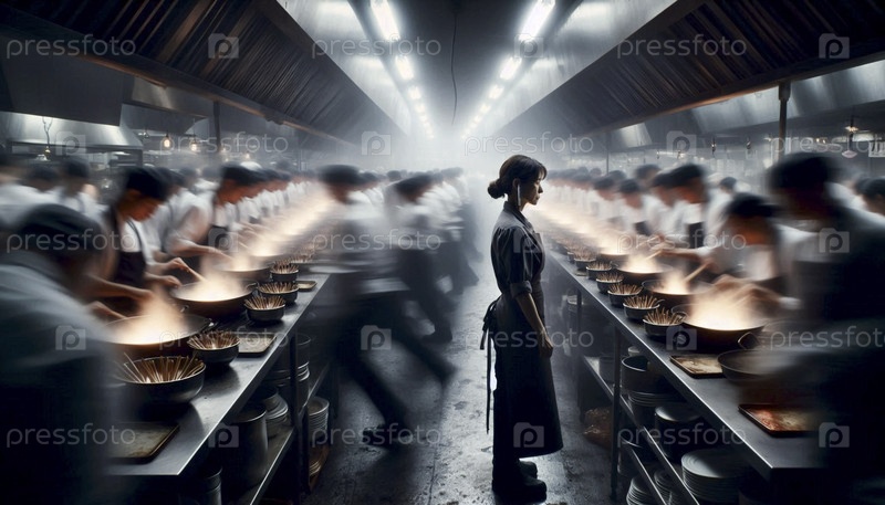 Более широкий кинематографический снимок окружающей среды, сделанный на хаотичной промышленной кухне, заполненной паромом во время обеда, Ai generated image