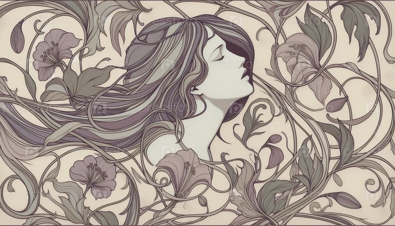Деликатный женский профиль в стиле модерн и бесшовный рисунок лозы, Ai создали изображение