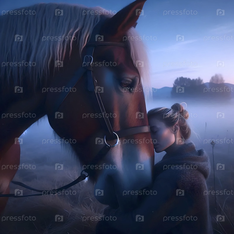 Женщина шепчет лошади на рассвете, Ай создал изображение