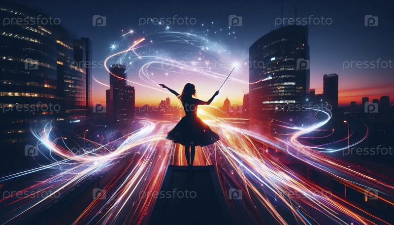 Девушка дирижирует симфонией городских огней с помощью искры, Ai generated image