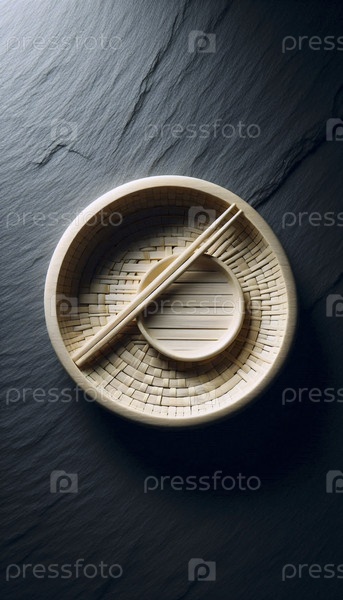 Круглый, пустой макет бамбуковой суши-платки со подставкой на палочках, на темной поверхности сланца, Ai generated image