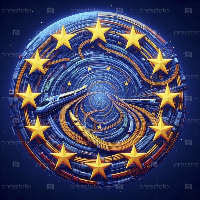 Флаг Европейского союза сделан из взаимосвязанных железнодорожных сетей, Ai generated image
