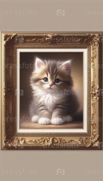 Миниатюрная масляная живопись Милая кошка в золотой раме, A Ai generated image
