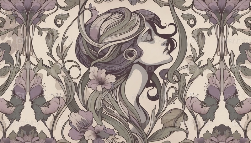Деликатный женский профиль в стиле модерн и бесшовный рисунок лозы, Ai создали изображение