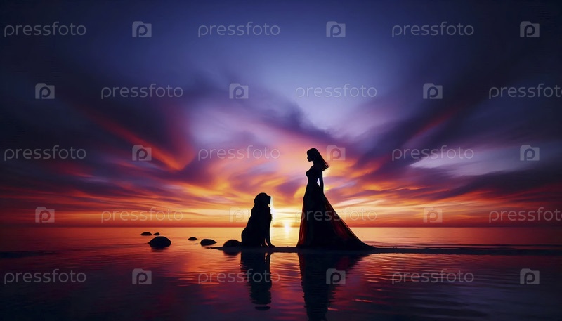 Силуэт женщины с собакой на закате, Ай создал изображение