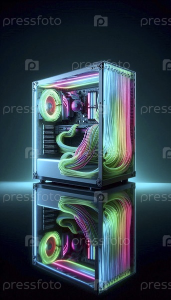 Прозрачный акриловый макет корпуса башни ПК с цветными кабелями внутри, на зеркале создано изображение Ai