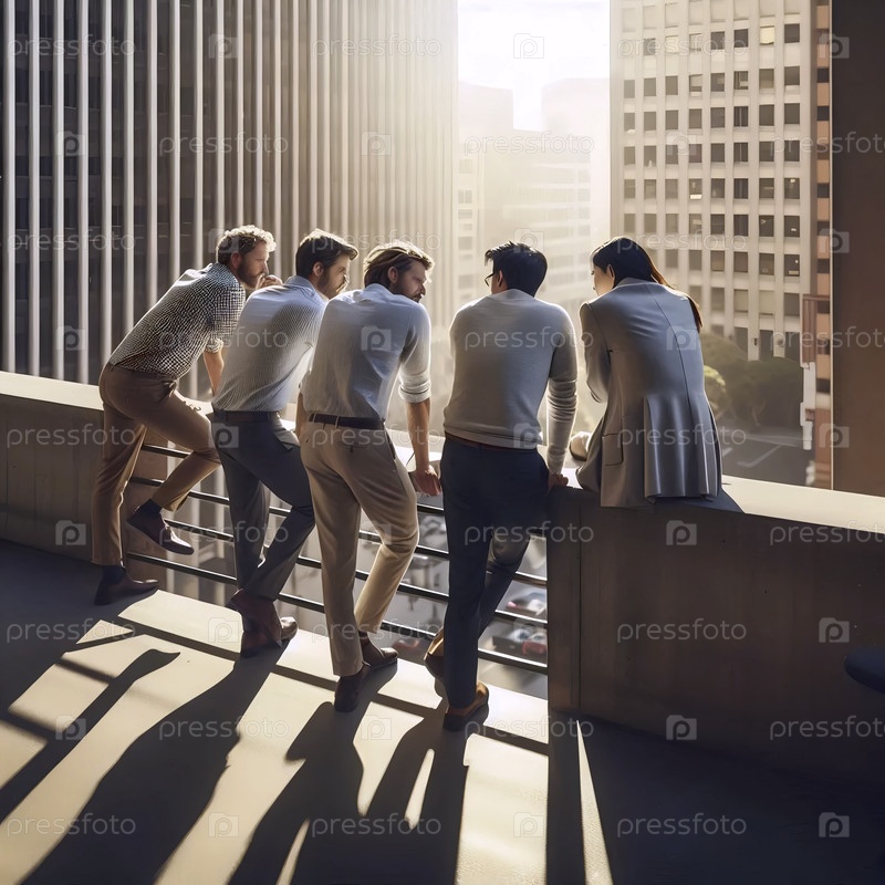 Неформальная стратегическая сессия команды на балконе современного офиса в золотое время, Ai generated image