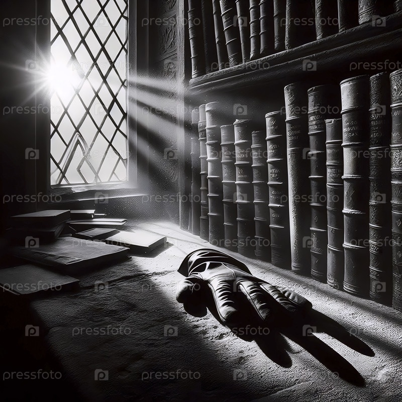 Человеческая кожаная перчатка на каменном подоконнике в библиотеке, Ai generated image