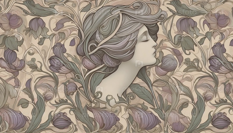 Деликатный женский профиль в стиле модерн и бесшовный рисунок лозы, Ai создали изображение