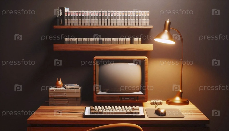 Мокет орехового стола с пустыми пробелами для монитора CRT и винтажной клавиатуры, под полкой с пустыми слотами для картриджей для игр, Ai generated image