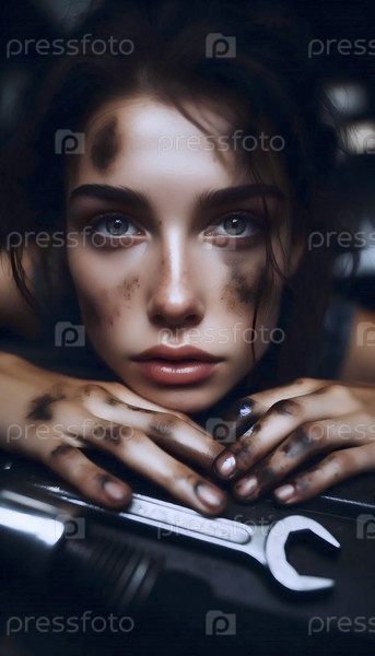 Ближайший план рук и лица девушки-механика, Ай создал изображение