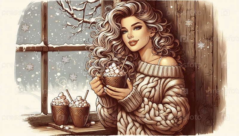 Пин-ап девушка в уютном свитере, держащая две чашки горячего какао, Ai generated image