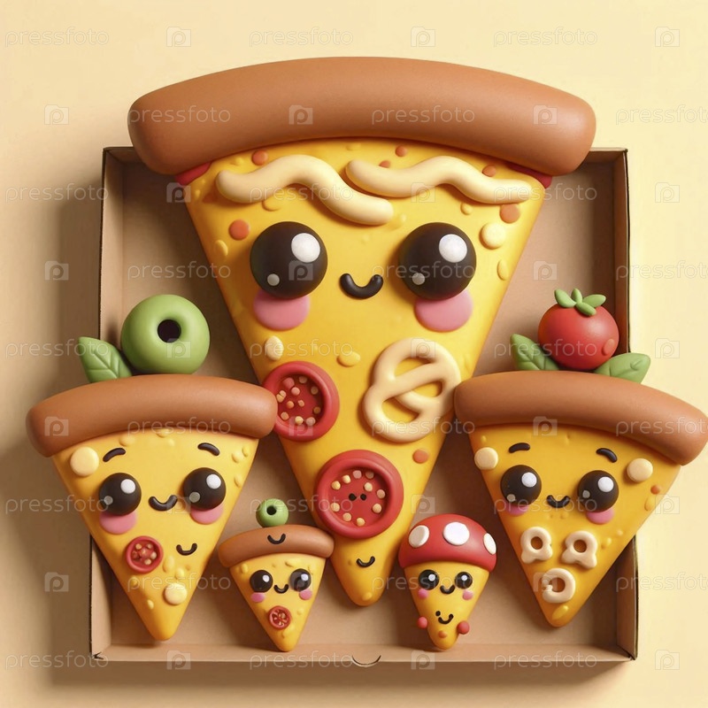 Каваи-сцена семьи с кусочками пиццы, Ai generated image