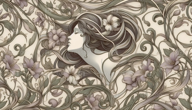 Деликатный женский профиль в стиле модерн и бесшовный рисунок лозы, Ai создали изображение