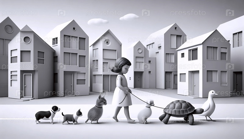 Иллюстрация середины века ребенка, ведущего шествие животных, Ai generated image