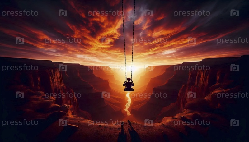 Два ребенка на колесной качели над каньоном при закате, Ai generated image