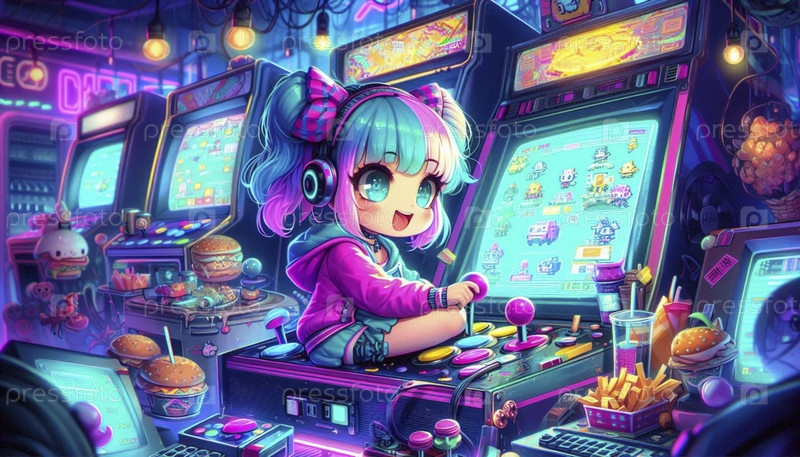 Подробная сцена кавайи в виртуальной аркаде, Ai generated image