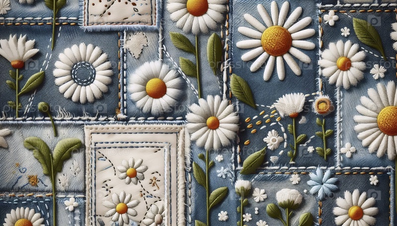A denim patchwork pattern with Daisy Jeans цветочные мотивы бесшовные, Ai generated image
