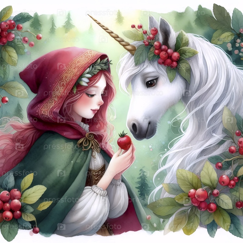 Принцесса и единорог Делятся акварельной живописью Берри, Ai generated image A