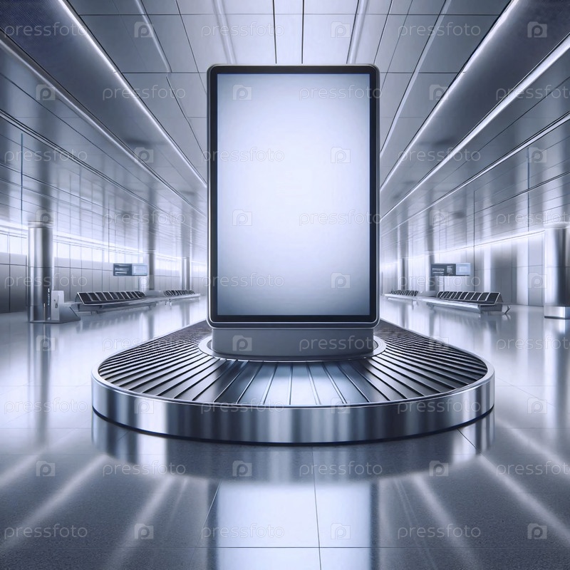 Выгнутый панорамный рекламный макет-панел расположен над пустой багажной каруселью аэропорта, Ai generated image