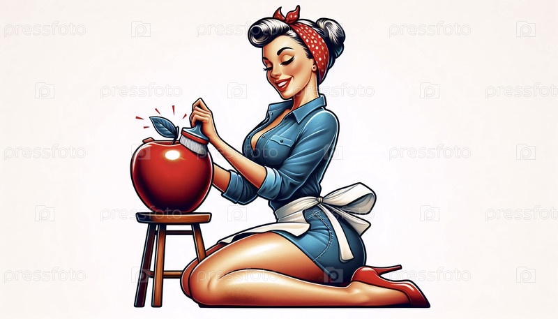 Ретро-пинальная девушка полирует гигантское яблоко, Ai generated image