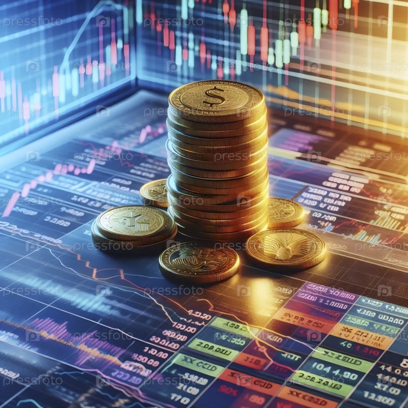 Таблица золотых монет на финансовых графиках, Ai generated image