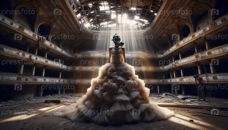 Женщина в газовой маске и вечернем платье в заброшенной опере, Ai generated image