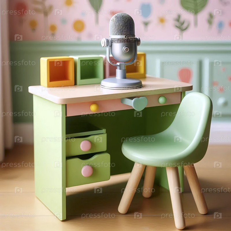 Небольшой красочный макет рабочего стола со встроенными шкафами для хранения и крошечным пустым микрофоном на низком стенде, в игровой комнате Ai создал изображение