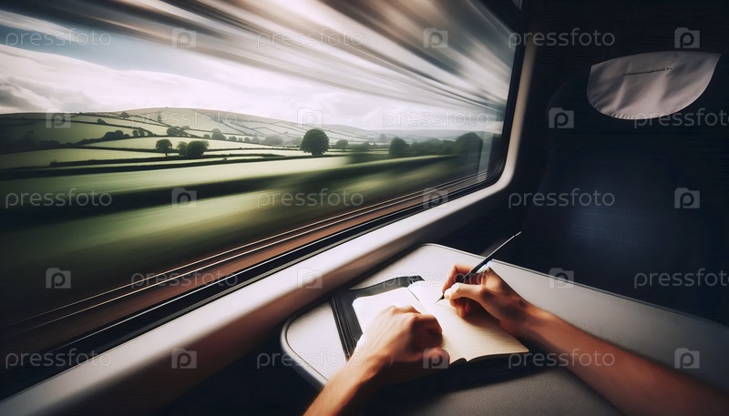 Одинокий писатель находит вдохновение во время поездки на поезде, записывая свои мысли в блокноте против размытого пейзажа, Ai generated image