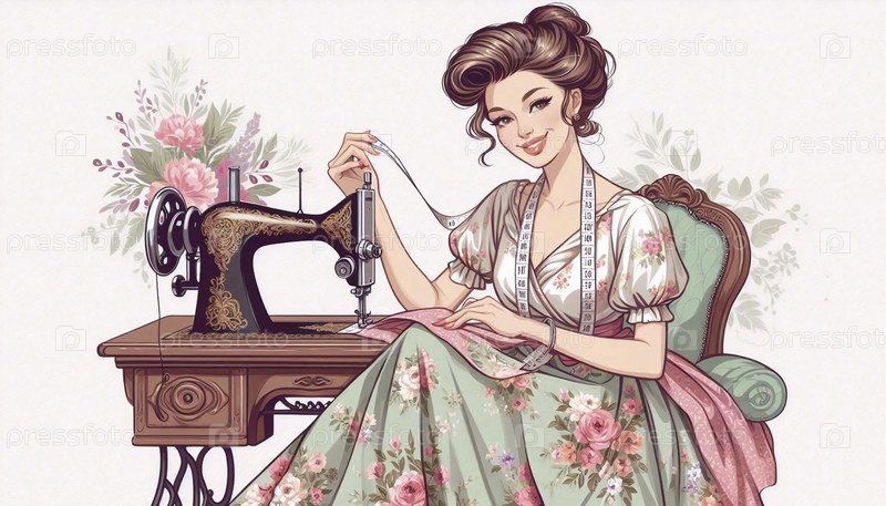 Девушка, нарисованная в качестве швеи на старинной швейной машине, Ai generated image