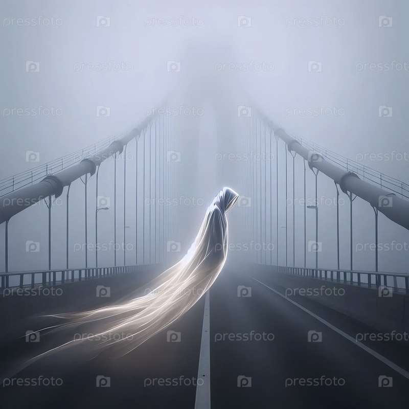 Фотография с длительной экспозицией, на которой фигура в капюшоне пересекает туманный мост, Ai generated image
