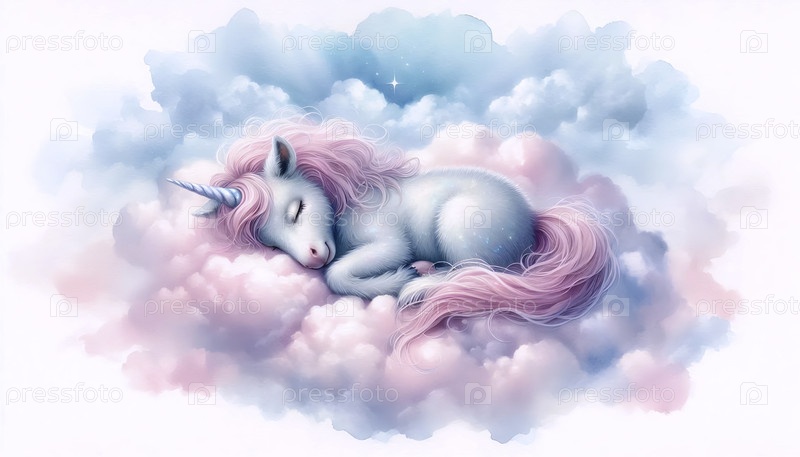 Единорог спит на облаке акварельный художественный отпечаток, Ai generated image
