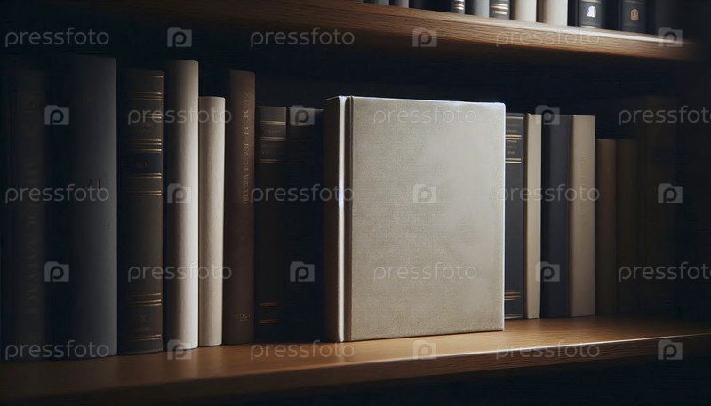 Мокет книги в жесткой обложке с пустой лентой, расположенный между другими книгами на полке, Ai generated image