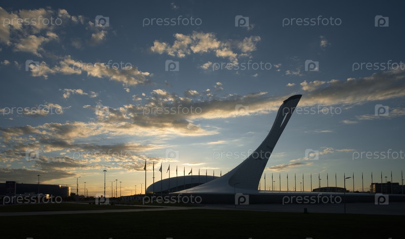 Сочи, Россия. 8 октября 2024 года. Живописная панорама на закате осеннего дня на главной олимпийской площади с чашей олимпийского огня в форме белого лебедя