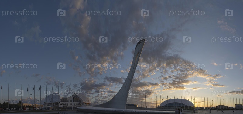 Сочи, Россия. 8 октября 2024 года. Живописная панорама на закате осеннего дня на главной олимпийской площади с чашей олимпийского огня в форме белого лебедя