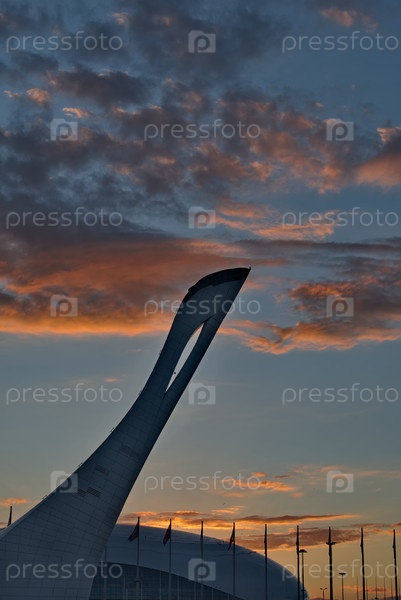 Сочи, Россия. 8 октября 2024 года. Живописная панорама на закате осеннего дня на главной олимпийской площади с чашей олимпийского огня в форме белого лебедя