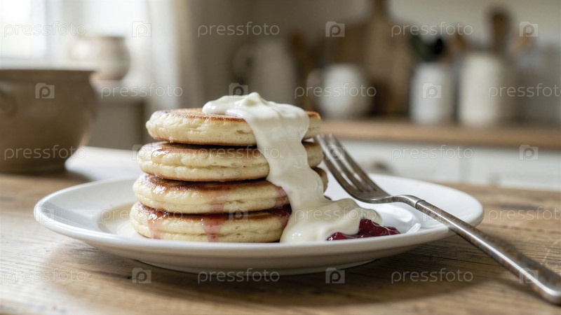 Куча блинчиков со сливкой и варенем для восхитительного завтрака