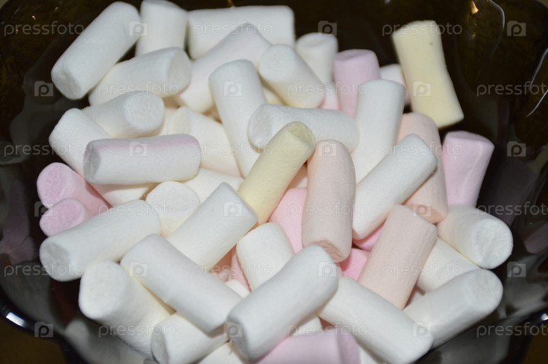 Многоцветные десертные батончики маршмелоу в стеклянной миске, крупный план. вкусная, мягкая сладость для детей и взрослых. высококалорийная пища. нездоровая диета