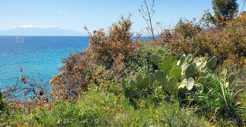 Берег покрыт травой с кактусами и видом на бесконечное голубое море. красота природы во время прогулки. правильное направление для путешествий в течение отпуска или каникул