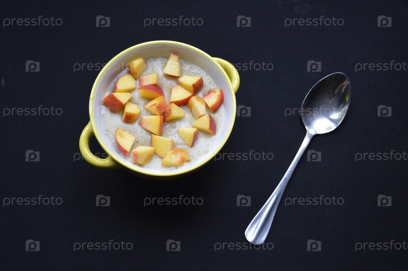 Овсянка, приготовленная в молоке с кусками спелого персика в миске на черном фоне. вкусная и здоровая пища для детей и взрослых. витамины из всех свежих фруктов и клетчатки в каше. диетическая еда