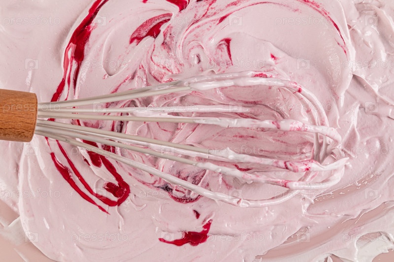 Виски для биения в оставшийся белый ванильный крем с розовыми линиями из фруктового сиропа, чтобы сделать его кремом. вид сверху. селективный фокус