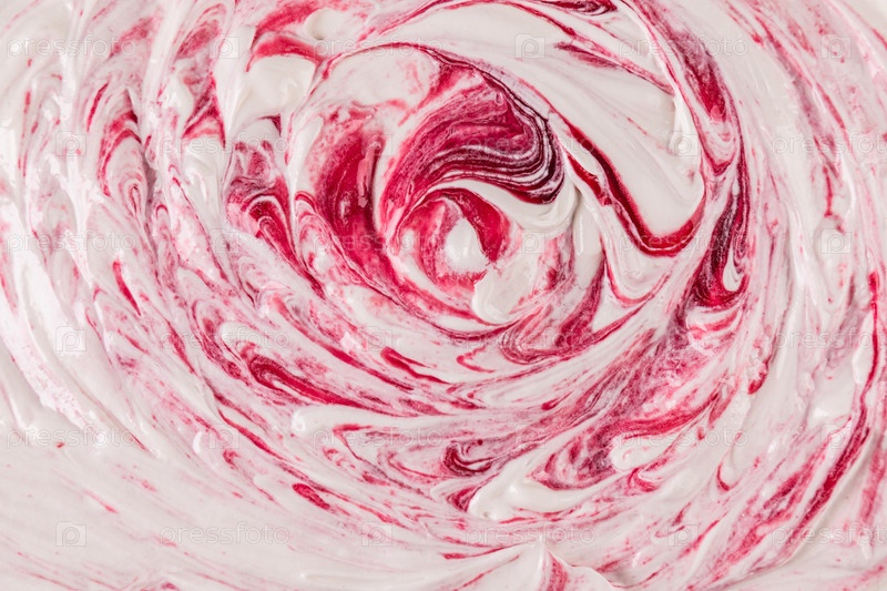 Деликатная текстура легкого ванильного крема с фруктовым сиропом или вишневым или малиновым вареньем. Красивые локоны от бичевого масла. верхний вид. селективный фокус