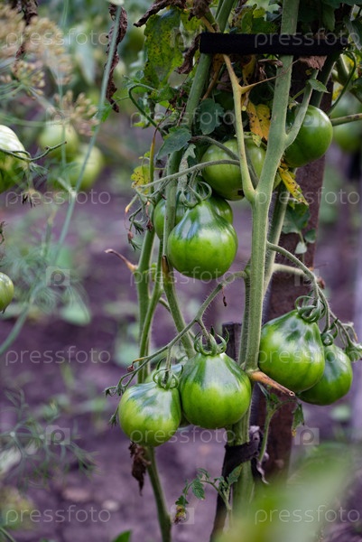 Куча свежих помидоров, растущих на ветке растения в солнечный день в саду