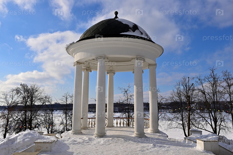 Вид на беседку А. Н. Островского на берегу Волги солнечным зимним утром