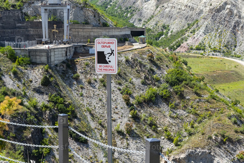Предупреждающий Знак, Указывающий на Опасность Обрыва Вблизи Плотины Гидроэлектростанции