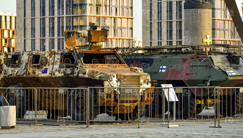 Сгоревшая трофейная бронемашина НАТО на выставке трофеев СВО в Парке Победы
