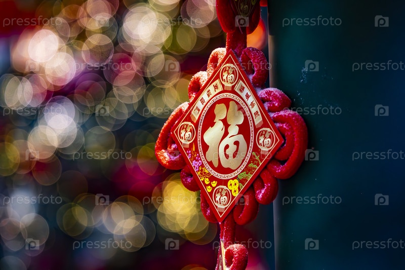 Традиционный китайский новогодний амулет Фу с иероглифом счастья на фоне праздничных огней