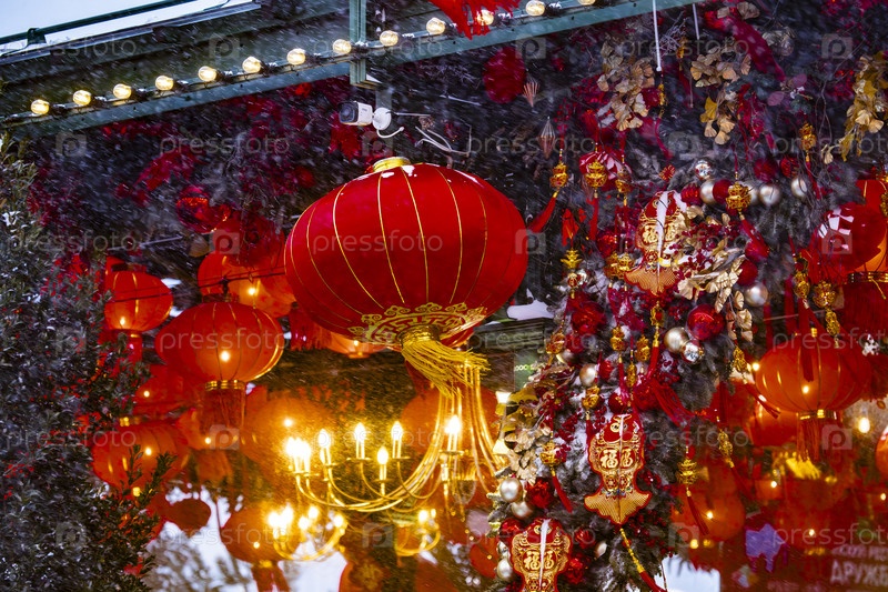 Красные китайские фонари с снегом
