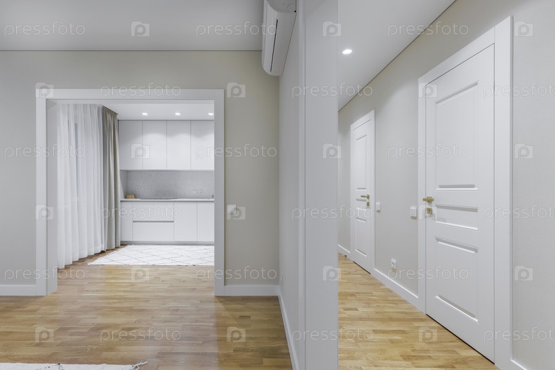 Профессиональный снимок интерьера современной квартиры.Взгляд отличается ярким коридором с белыми дверями, латунными ручками и дубовым паркетом, с открытым входом, ведущим к гладкой минималистической белой кухне с плиточным полом и углубленным освещением