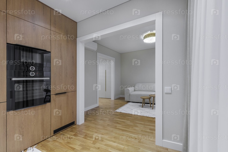 Профессиональный снимок интерьера, демонстрирующий современную кухню со встроенными темными приборами и деревянными шкафами.Открытая дверь ведет в минималистическую гостиную с диваном и легкими полов из древесины, создавая просторное открытое ощущение